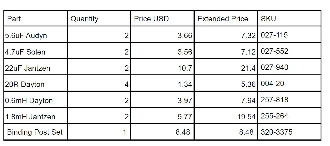 Below is the parts list for building a pair with SKUs from Parts Express. The 20R resistors are used in parallel to give 10R with a higher power rating. This shouldn’t be necessary but doesn’t hurt. The cost comes out to around $75 plus the new plate.