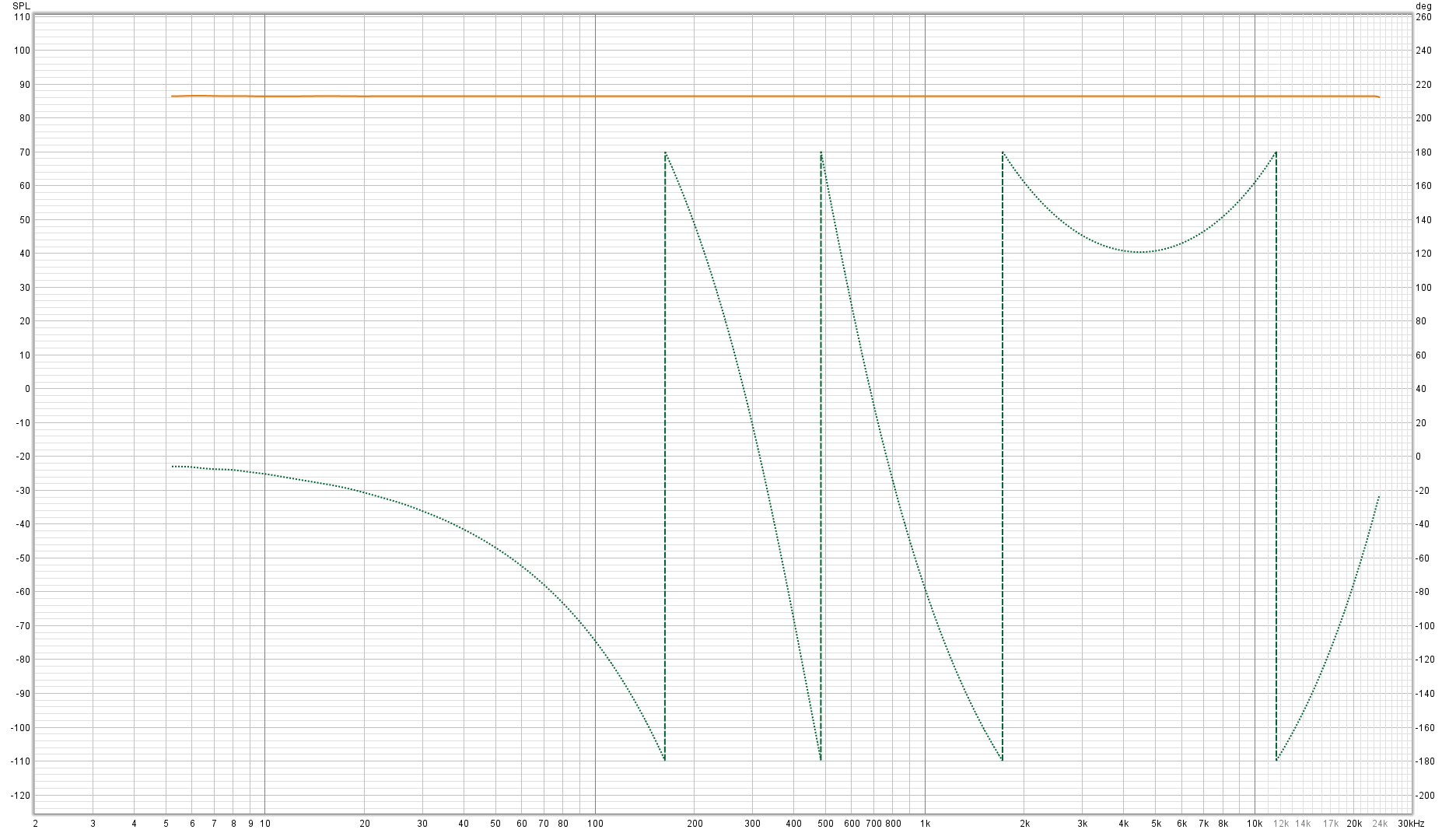 Let’s look at a theoretical 2-way speaker with an entirely flat frequency response. In the image below you’ll see a straight line which is the frequency response and a curved line which is the phase response. The discontinuity in the phase response happens because we’re looking at a “wrapped” graph meaning we keep things between 180 and -180 degrees. When it goes beyond that, it gets wrapped back around so we can see everything within a small window. If we unwrap it, the line would keep extending up and that’s what happens in reality.
